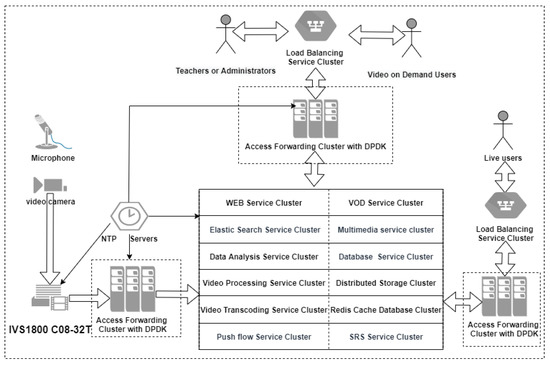 The system consists of acquisition equipment (microphone and video camera to realize the acquisition of sound and video signals in smart classrooms), encoding equipment (IVS1800 C08-32T: cloud video recorder with encoding, staging, and intelligent analysis), an access and forwarding cluster with DPDK acceleration (realizing the receiving and forwarding of highly concurrent multiple audio and video streams), a push flow service cluster (pushes content to the connected servers or clients), a live service cluster (SRS Live service cluster: live streaming video in real time), a distributed storage cluster (stores audio and video data for on-demand), a Redis cache database cluster (realizes the data caching function), a multimedia service cluster (processes audio and video data and completes interaction work on the user side), a data analysis service cluster (mainly for collecting user data), a database service cluster (stores business data of all business systems), an elastic search service cluster (also known as an elastic distributed analysis search service cluster, and is a distributed storage system that can store user behavior data on multiple nodes, which, in turn, is a highly scalable search and data analysis engine for statistical analysis and other functions of the direct recording system), a video transcoding service cluster (plays the corresponding content of the corresponding source video requested by users), a web service cluster (provides users with all web business api services), a video transcoding service cluster (transcodes recorded videos or uploaded videos), a load balancing service cluster (allows users’ access to share the load to different physical servers through some control policies), and a global time synchronization service cluster (network time protocol servers ensure the whole system’s time synchronization). The video live broadcast and recorded broadcast scenario usually includes core business modules such as audio and video capture, pushing flow, transcoding, storage, distribution, and playback, as well as interactive business logic such as Q&A, which supports 200 edge recorded broadcast and live broadcast classrooms and supports 5000 concurrent logins and online viewing. The user experience has high requirements for clarity, playback fluency, playback delay, etc. The edge recorded broadcast and live broadcast system has a large number of small packet transmissions of video streams, and the traditional way is to use interrupt scheduling NIC transmission, which seriously affects the transmission performance. The work in this paper focuses on accessing and forwarding clusters for the data streams in Figure 1 and using DPDK technology to accelerate the transmission of concurrent video streams.