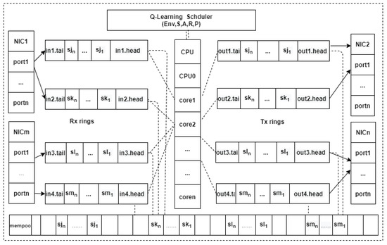 The system model mainly consists of a Q-learning scheduler, DPDK multi-network card multi-port transmission module, memory pool and multi-loop queue for receiving and forwarding, etc. The overall architecture is shown in Figure 2. The detailed design scheme is as follows.