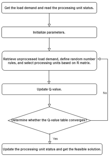 In summary, this reward value function tends to meet the transfer demand while trying to balance the load on the processing units. To reflect the small gap between variables, an exponential function with a natural logarithm base was used, and the flow chart of the algorithm is shown in Figure 4.