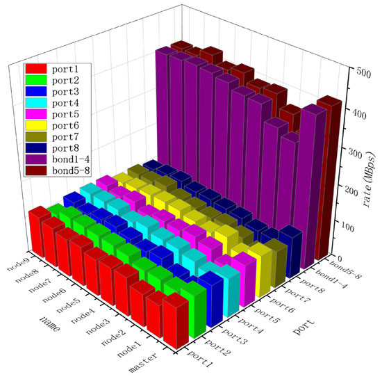 The purpose of the experiments in this section is to verify the optimization effect of the parallel transmission performance of multiple NICs. The benchmark solution is a multi-network, multi-port concurrent transmission. A total of 2 NICs were designed here, each with 4 ports and 8 ports transmitting data individually; the optimization scheme is to use link aggregation transmission, setting 4 ports of the sending server and receiving server NICs as bond 1–4 and bond 5–8 through the balance mode of the ovs-bond system. The Q-learning scheduling transmission scheme of DPDK was used to test the transmission rate, packet loss rate, and time delay when transmitting 64 B small stream packets.