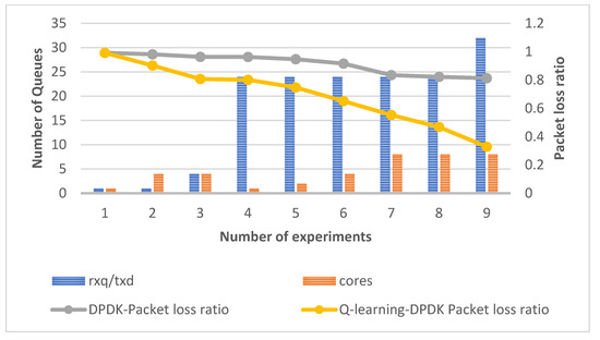 As shown in Table 5, when the number of sending packets is 100,000,000, by setting the same number of sending and receiving queues, the packet loss rate decreases gradually as the number of cores and queues increase. The concurrent performance of the traditional DPDK and the DPDK with Q-learning scheduling was compared by adjusting the size of the sending packets, the number of CPU cores, the number of sending queues, the number of receiving queues, the length of sending queues, and the length of receiving queues to test the number of received packets and the latency.
