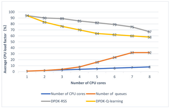The impact of the number of CPU cores and the number of queues on the average CPU load factor was further considered. As shown in Figure 7, when the number of CPU cores is the same, the longer the queue, the higher the number of receiving burst packets; the higher the queues number, the higher the capacity of receiving data burst packets, and thus the better the transmission performance of the video quantity. When the number of queues and queue length are the same, the larger the number of CPU cores, the larger the number of burst packets received, indicating a better forwarding performance of the system. As the number of CPU cores queues and queue length increase, the number of burst packets received in the experiment is larger, indicating a better forwarding performance. However, the more difficult the scheduling and the longer the scheduling period, the more prominent the boosting advantage of Q-learning scheduling becomes for CPU load balancing. Under the same conditions, Q-learning’s DPDK scheduling has a lower average CPU load ratio than RSS scheduling, as shown in Figure 7.