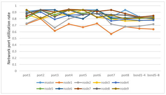 The purpose of experiments in this section is to verify the impact of dynamic port optimization on transmission performance. The main idea is to adjust the number of NIC ports according to the classified transmission volume of live and on-demand packets received and test the impact on the transmission performance after dynamically adjusting the number of ports. In the experiments, 2 network cards with 8 ports were used to send 10 GB of data multiple times under an equal or unequal number of network ports. The group sizes were 64 B, 128 B, 256 B, 516 B, and 1024 B. The load factor and packet loss rate of each network port of the sending and receiving servers were calculated. Based on the experiments in the previous section, the traffic was limited to 4 Gb/s, the information of each server node was collected every 5 s, and the utilization rate of each network port was calculated. Figure 8 shows the node network port utilization before and after Q-learning load balancing, which significantly reduces the NIC load rate.