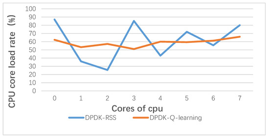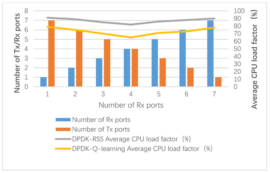 When the number of receiving ports is close to the number of sending ports, the average load ratio of all cores is the smallest and the performance is optimal. The data loss rate is positively correlated with the number of sending ports; the data stream receiving performance is correlated with the receiving ports; the greater the amount of receiving ports, the better the ability to handle burst traffic. The average CPU load rate is significantly lower when comparing Q-learning’s DPDK scheduling with RSS scheduling, and the corresponding relationship between the CPU load rate and the number of receiving and forwarding ports is shown in Figure 9.