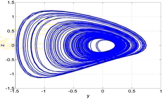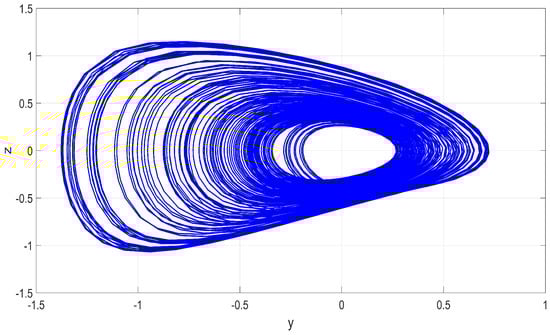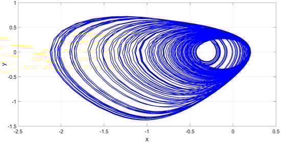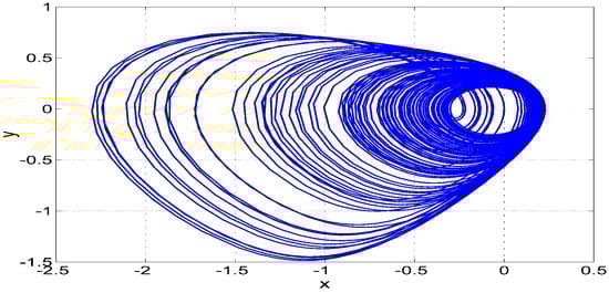 MATLAB phase plot in plane of the 3-D chaotic jerk system (17) for Case (B), where and .