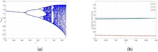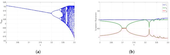To analyze how changes in the values of affect the qualitative behavior of the jerk system (17), we fix the values of and as and , and vary the values of in the interval . The Lyapunov exponents spectrum and the bifurcation diagram of the jerk system (17) are illustrated in Figure 9, indicating that as increases within this range, the 3-D jerk system (17) can exhibit both periodic and chaotic behavior.