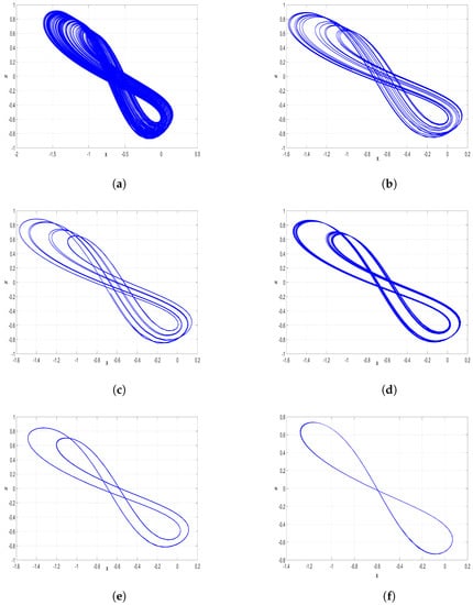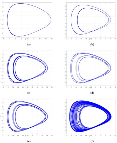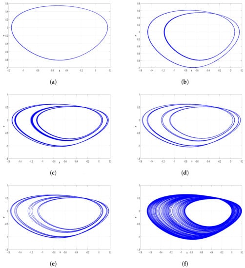 2-D MATLAB plots of the new jerk system (17) in plane for , and . (a) Period-1 for ; (b) Period-2 for ; (c) Period-4 for ; (d) Period-8 for ; (e) Period-16 for ; (f) Chaos for .