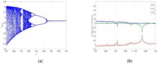 The bifurcation diagram presented in Figure 7 illustrates that the system experiences a series of period-doubling as the parameter increases, resulting in the well-known period-doubling route to chaos within specific ranges of parameter .
