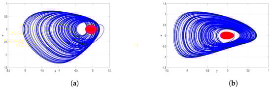 The values of the parameter have a significant impact on the behavior of the jerk system (17). For instance, when takes values in the interval , the jerk system (17) exhibits a chaotic attractor. When takes values in the interval , a period-16 attractor for the jerk system (17) is observed. Similarly, a period-8 attractor occurs for the jerk system (17) when takes values in the interval . Also, a period-4 attractor is observed for the jerk system (17) when takes values in the interval . Furthermore, a period-2 attractor is observed for the jerk system (17) when takes values in the interval . Finally, a period-1 attractor is observed for the jerk system (17) when takes values in the interval .