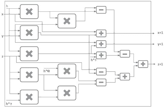 It is worth mentioning that Forward Euler method is quite useful for an implementation with the lowest count of hardware resources, although it has less precision than other numerical methods, such as the fourth-order Runge-Kutta method or multi-steps methods [37]. To observe an attractor, it is necessary to estimate the step-size h. In this work, it is set to , and the computer arithmetic is performed using 32-bit, with a fixed-point notation in the format 8.24, which means that one bit is associated with the sign, seven bits with the integer part, and 25 bits with the fractional part. The equations given in (57), can be described in a block diagram, as the one shown in Figure 16, where it can be appreciated that the circuit is composed of eight multipliers, five adders, and four subtractors.