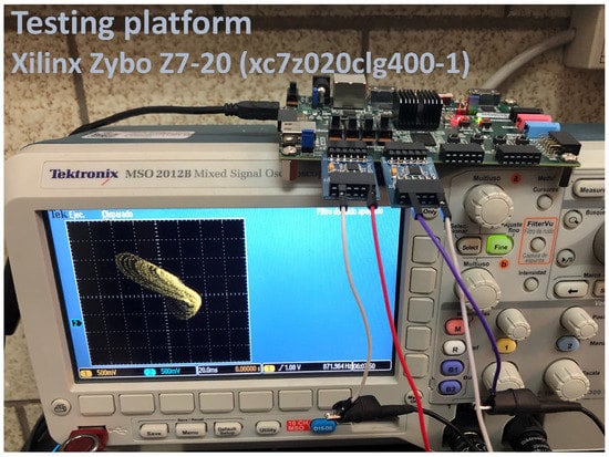 The block description of the design shown in Figure 16, can be described under the language named Very-High-Speed Integrated Circuit Hardware Description Language (VHDL in short). The synthesis of the VHDL description is performed using Xilinx Vivado tool. As a result, the discretized new jerk system with a stable equilibrium given in (57), is implemented herein on the Zybo Z7-20 development board with xc7z020clg400-1. The experimental setup is shown in Figure 17, where one can see the oscilloscope, the FPGA Zybo Z7-20, and two digital-to-analog (DAC) converters to observe the signals. The latency of the FPGA design is two clock cycles. In this manner, the hardware resources are summarized in Table 5.