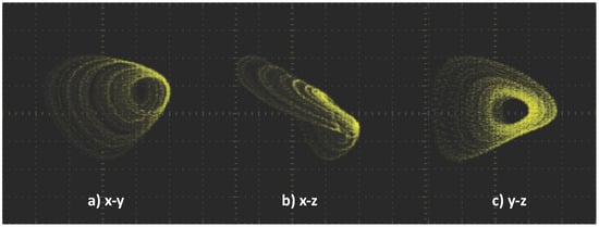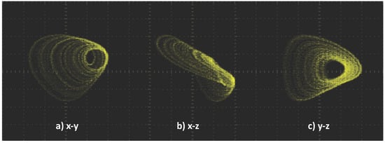 The experimental attractors can be observed as depicted in the Figure 18 and Figure 19. Two Cases (A and B) have been tested, both with initial conditions equal to , , , and with a time-step set to . Case A works with the coefficient values , , , and the experimental attractors are shown in Figure 18. Case B works with the coefficient values , , , and the experimental attractors are shown in Figure 19.