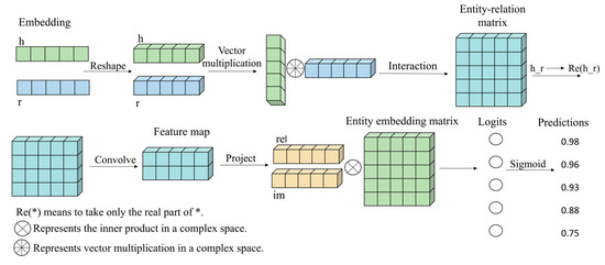 There are also tensor-decomposition-based models similar to the translation-based models, which also use a simple structure in exchange for high efficiency. RESCAL [11] is a typical representative of this subgroup. It encodes each triplet as a tensor and a matrix and handles the knowledge graph complementation problem by optimizing the bilinear product between the core tensor and the factor matrix. Although RESCAL is a powerful model, it can easily overfit during training due to the large number of parameters used. DistMult [12] reduces the number of operations in RESCAL by replacing the core tensor with a diagonal matrix, which reduces the possibility of overfitting. However, DistMult cannot encode antisymmetric relations, which is its fatal flaw. In order to solve this problem, ComplEx [13] embeds DistMult into the complex vector space and encodes the antisymmetric relations in the triplet through the anti-symmetry of the Hermitian inner product, which makes up for the deficiencies of DistMult.