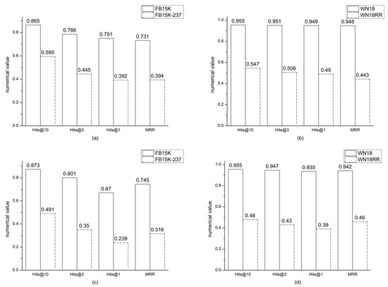 “Test leakage” results, using: (a) ConCMH on FB15k and FB15k-237; (b) ConCMH on WN18 and WN18RR; (c) ConvE on FB15k and FB15k-237; (d) ConvE on WN18 and WN18RR.