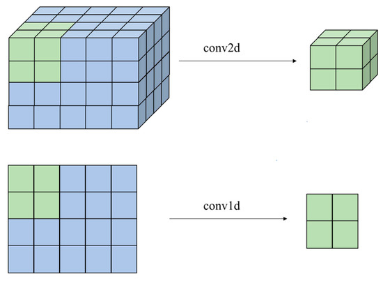 Then, we compared the use of two convolution types for feature extraction, namely 2D convolution (e.g., used by ConvE and CTKGC) and 1D convolution (e.g., used by ConvKB). In terms of computational nature, there is no difference between the two types; both move along the dimension of input data. However, the 1D convolution moves along a single dimension, while the 2D convolution moves along two dimensions. For the complementation of knowledge graphs, the essential difference between the two convolution types is related to the remodeling of input data. With the 1D convolution, the entity–relation interaction matrix needs to be remodeled into 2D, whereas with the 2D convolution, it is remodeled into 3D. In the case of the same embedding dimension, the 3D interaction matrix has more interaction points than the 2D interaction matrix, which deepens the connection of a triplet in its neighborhood, as illustrated in Figure 4. As can be seen from Table 7, when using 2D convolution, the values of all evaluation metrics for ConCMH are higher than those of 1D convolution.