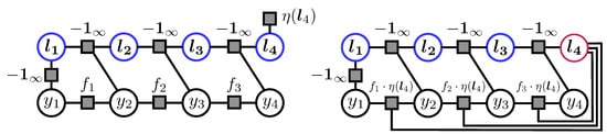 Here, denotes the indicator function such that if the argument in is true and otherwise. The indicator functions rule out the configurations that do not satisfy Equation (4) when maximization is performed. A corresponding factor graph for margin scaling is illustrated by the leftmost graph in Figure 2. We can see that our new augmented objective (6) shows only local dependencies and is, in fact, 2-decomposable.