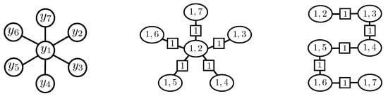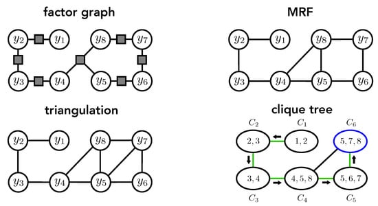 First, similar to the conventional junction-tree algorithm, we need to construct a clique tree for a given set of factors that preserves the family structure and has the running intersection property. Note that we ignore the global term during this process. The corresponding energy is given by the function F according to the definition of Problem 1. There are two equivalent approaches for constructing the click tree [,]. The first is based on variable elimination and the second is based on graph triangulation, with an upper bound of . Figure 3 illustrates the intermediate steps of the corresponding construction process for a given factor graph using the triangulation approach. The resulting clique tree example defines the starting point for our message-passing algorithm.