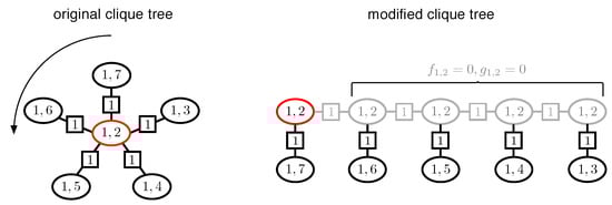 Furthermore, we can deal with sepset duplicates by iteratively rearranging the edges in the clique tree such that for every sepset from the possibilities, there is at most one duplicate providing an upper bound of on the number of edges for each node. More precisely, we first choose a node with more than neighbors as the root and then reshape the clique tree by propagating some of the duplicate edges (together with the corresponding subtrees) toward the leaves, as illustrated in Figure A2. The duplicate edges of nodes connected to the leaves of the clique tree can be reattached in a sequential manner similar to the example shown in Figure 4. Due to this procedure, the maximal number of duplicates for every sepset is upper bounded by 2. Multiplied by the maximal number of possible sepsets for each node, we obtain an upper bound on the number of neighbors in the reshaped clique tree given by . □
