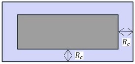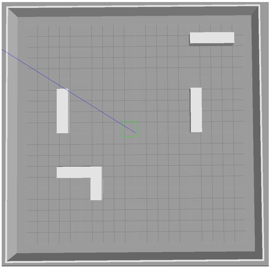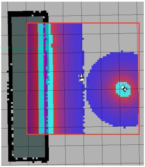 During search movement, the robot must maneuver around obstacles and other robots. Each robot maintains a local map centered on itself and continuously updates this map as it moves. The size of the local map is determined by . The robot and obstacle create a collision zone that extends outward, denoted by . An expansion area is established outside of the robot’s collision zone, and its size determined by , as illustrated in Figure 5 and Figure 6. To avoid obstacles, the robot plans its path by referencing its local map and adjusting to changes in the expansion zone as obstacles emerge. Unreachable positions occur if they fall within the robot’s collision zone. Throughout the simulation process, the local map size for is set to 3 m, the collision zone is set to 0.15 m with , while the expansion radius is adjusted to 1 m with . Figure 7 displays the simulation’s impact on the environment. The local map size maintained by each robot appears as a red boxed area.