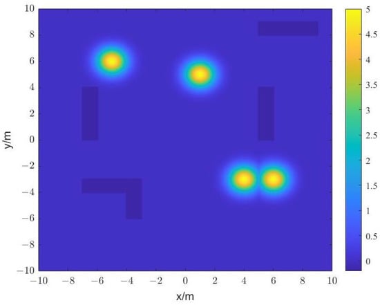 In this paper, we investigate a rectangular search area of dimensions containing obstacles represented by polygons, as illustrated in Figure 1. It is assumed that all targets are randomly dispersed throughout the search area and emit light or radiation as a signal that decreases gradually with increasing distance from the target, rendering it invisible beyond a certain range. The signal strength encompasses a range of 0 to 5, as shown in the chromatic scale in Figure 2 (the signal type is decided by the actual situation, and the value represents the relative size).