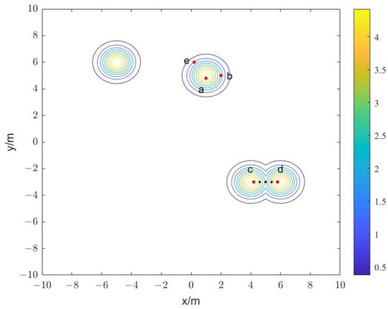The following paragraph provides an overview of the process employed to select SAPs using a specific algorithm. Figure 3 depicts five candidate positions, represented by a, b, c, d, and e, ranked by signal strength as , and highlights SAPs a and c based on the applied Equation (20). However, position d, despite not satisfying Equation (20), is proximate to a distinct target compared to the one approached by c and should also be identified as a SAP. In this case, reference positions between position c and d are illustrated by black dots, and their signal strength is compared to and . Equation (21) is used to determine whether position d approaches a different target from the known SAPs. If Equation (21) is satisfied, position d is annotated as a new SAP. Positions b and e are not considered as SAPs because they fail to satisfy either Equation (20) or (21).