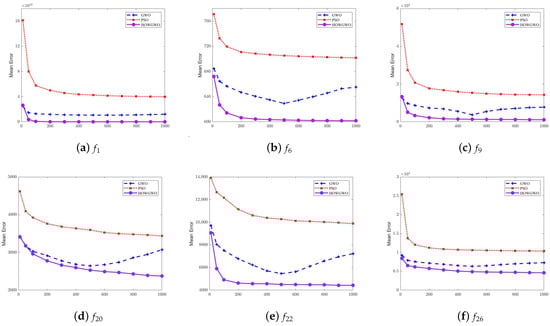 Figure 8 visually displays the performance differences between the algorithms. The figure plots the average convergence of each competing algorithm over 30 independent runs for a number of selected functions. The horizontal axis is the number of times the function was evaluated, and the vertical axis is the average of the errors. In Figure 8, the algorithms GWO, PSO, and HOWGWO are indicated by the blue dashed line marked with a plus sign, the red dashed line with the cross mark, and the purple solid line with the circle mark, respectively. The x-axis records the number of times the function was evaluated, and the y-axis is the average error. To reduce the complexity of the figure, we show the average error of these convergence curves at the points [0.01, 0.05, 0.1, 0.2, 0.3, 0.4, 0.5, 0.6, 0.7, 0.8, 0.9, 1.0]*NFE, where NFE is the maximum number of function evaluations. Thus, each curve has 12 marked points. As illustrated in the figure, the average convergence speed of the HOWGWO algorithm is significantly better than that of its competitors, especially in solving certain functions (e.g., 6 and 22), where the proposed algorithm can converge to the optimal solution faster. This superior performance can mainly be attributed to the fact that the leader wolf uses the historical optimal positions of all individual grey wolves through Equation (17) to make an effective estimate of the location of the prey, and this estimated position is closer to the global optimal solution.