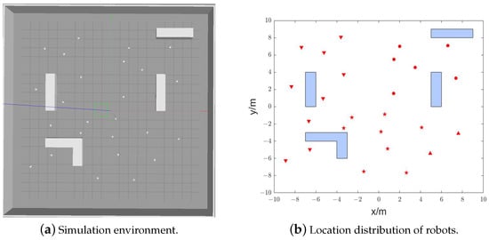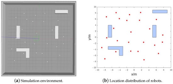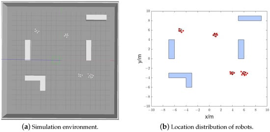 The initial positions of the robots are randomly generated throughout the search area, with the exception of areas that were occupied by obstacles, and then their positions are updated by