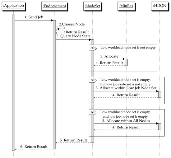 Although BaaS utilizes concepts and techniques from cloud computing, the existing job allocation approaches used in cloud computing are insufficient for BaaS. Firstly, most job allocation approaches in cloud computing are based on allocating resources to virtual machines with consistent resources. This allows these allocation problems to be solved using boxing or heuristic algorithms [9,10]. However, in BaaS, jobs are allocated to containers with varying and dynamic resources during runtime. Secondly, BaaS job characteristics differ from those in cloud computing. The resources required by BaaS jobs are more complex and dynamic. For instance, when generating a new block in Fabric [11], the required resources are influenced by endorsement nodes and endorsement strategies. All in all, the existing job allocation approaches used in cloud computing cannot be directly applied to BaaS.