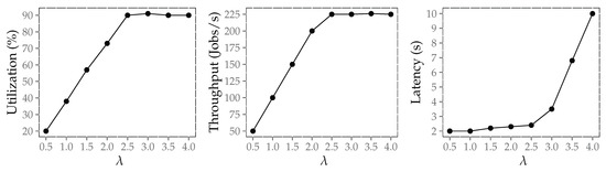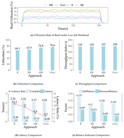 The results show that the utilization rate of Balanced-DRL was approximately 4% to 6% higher than that of other algorithms, with an average utilization rate of 97%, due to using HDQN to reduce node resource fragmentation and improve BaaS utilization. Correspondingly, the higher utilization rate led to a 5% to 8% increase in throughput for Balanced-DRL. Latency for Balanced-DRL was significantly reduced by 5% to 21%, partly due to a higher utilization rate, which allowed jobs to be allocated more resources and be executed more quickly, and partly due to job-workload balancing, which prevented excessive job latency on certain nodes. Finally, although R and RR also consider job-workload balancing, their job balancing factors are inferior to those of Balanced-DRL, as they achieve balance from a distribution perspective. In contrast, Balanced-DRL achieved balance from a job quantity perspective based on node job workloads.