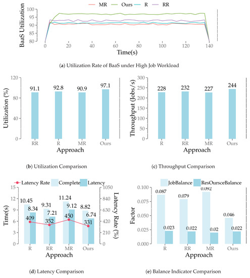 This experiment compared the performance of various allocation algorithms for BaaS clusters under time-varying job workloads. The experimental results show that the utilization rate and latency indicators of Balanced-DRL were superior to those of other algorithms. Obviously, since any time-varying job workload can be viewed as a sequence of high and low job workloads over time and the indicators of Balanced-DRL under high and low job loads were superior to those of other allocation algorithms, this algorithm can achieve certain optimizations for any job workload overall.