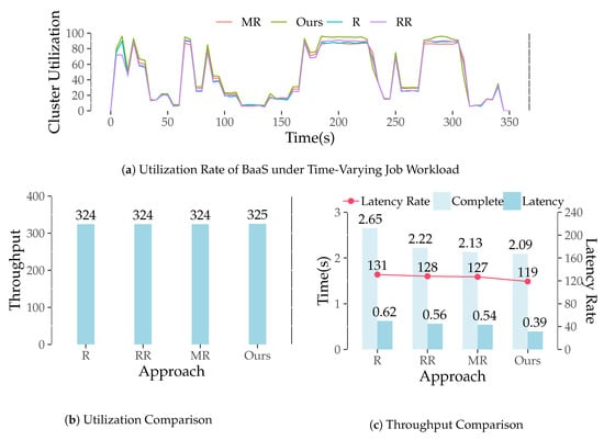 From Figure 10c, it can be seen that the throughput for different algorithms was similar, as most of the time, in the time-varying job workload scenario, we had low job workloads, similar to the real workload. Therefore, the total time required for the cluster to process the job workload was also similar.