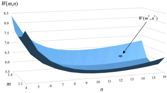 We use the following parameter values for a base illustrative example: Consider a service system in which customers arrive with a rate . For the service rates, we set , which allows us to calculate the MS’s service rate for each service and we use to represent the TS’s service rate. During the MS’s active period, the EL deteriorates at a rate of (see Equation (16)), and during the vacation, the EL grows at a rate of (see Equation (17)). Finally, we set the maximal EL to . These values are used because they satisfy the stability condition, which is given in Theorem 1 for a large range of m and n values, therefore enabling us to analyze the system’s performance for a wide range of parameters. Figure 1 and Table 2 present the values of the customers’ mean sojourn time, , for a wide range of combinations of with , where the best value (i.e., the minimal value) of , denoted as , is underlined and printed in bold in Table 2. The values in Table 2 are obtained by substituting the corresponding values of m and n into , where is calculated using Equation (9). According to the best solution, the main server serves customers in each cycle and then leaves for a vacation. The main server returns from vacation when their/its mean EL reaches . Thus, in the optimal setup, according to Equation (18), the server is on vacation for min, and the customers’ mean sojourn time in the system is min.