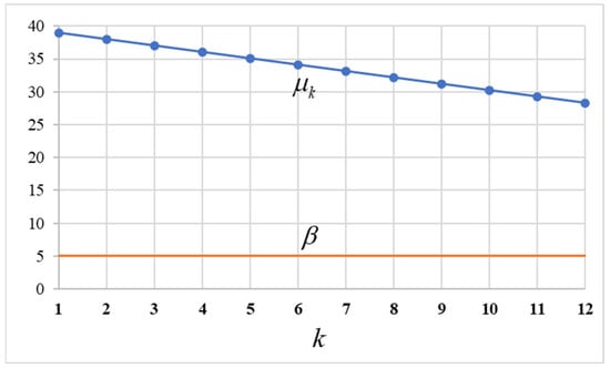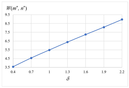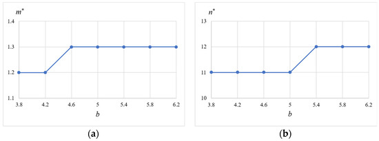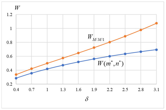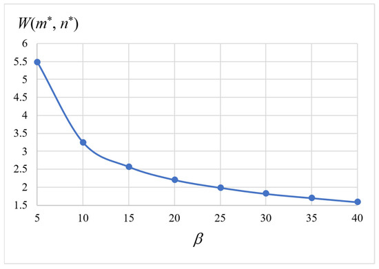 The system’s manager aims to use the vacation as a tool for improving efficiency for future customers, which is accomplished at the expense of current customers. Thus, the system’s manager intentionally sets the vacation policy, which involves setting both (i) the number of customers served by the MS in each work period (n) and (ii) the mean vacation time (). Such a control structure, in which a decision is made regarding the mean vacation time, is in line with prior works (see, e.g., [33]). Note that can be described by the values n and m (the greater the reduction in the mean EL that needs to be regained during the vacation (), the longer the required vacation will be). Thus, for a convenient presentation of the analysis, m and n are considered as the system’s decision variables. An example based on the explicit expression of the mean vacation time as a function of n and m is presented in the next section.