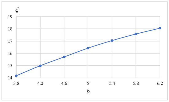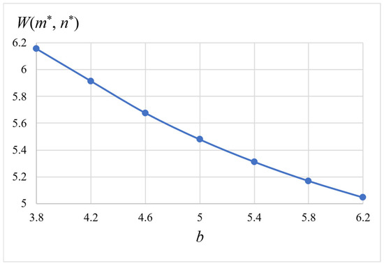 Figure 7 and Figure 8 illustrate the effects of changes in the recovery rate b on the system’s parameters. Figure 7 shows that, as can be expected, decreases linearly with the increase in the MS’s recovery rate. Figure 8 shows that both and are almost entirely robust to changes in b. This result can be explained by the vacation time, which acts as a function of b (see Equation (18)).