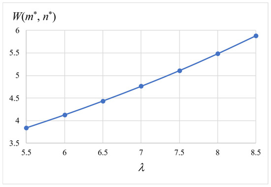 Finally, Figure 9 and Figure 10 present the effects of various customers’ arrival rates on the system. As can be expected, Figure 9 shows that increases linearly with the increase in the customers’ arrival rate, while Figure 10 shows that is totally robust to changes in , and slightly increases with the increase in . Interestingly, the figure shows that slightly increases with . This result can be explained as follows: as more customers arrive and enter the system, the MS is less idle during the time in which he/she/it is in the system and thus spends less time in the system.