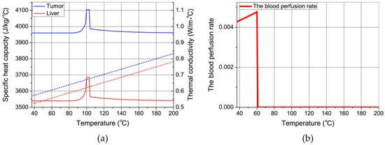 Based on Equations (15) and (12), the specific heat capacity and thermal conductivity in relation to the temperature change are calculated and shown in Figure 1a. Values of the specific heat capacity and thermal conductivity in tumors are around 10% higher than the ones in the liver tissue. This is beneficial for the processes of MWA because, under the same conditions, tumor tissue will heat faster than liver tissue. Thermal conductivity is a simple linear function of the temperature. Based on Equation (13), the blood perfusion rate in relation to the temperature is given in Figure 1b.