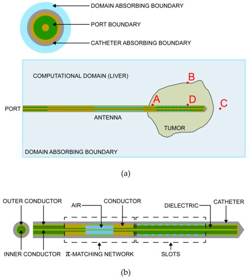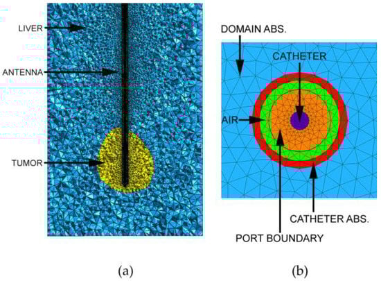 Figure 7a shows a cylindrical domain cross-section with the probe (dark), tumor (yellow), and liver (blue). The total volume of the domain was 254.47 cm3, and the total number of tetrahedrons was 640,604. In Figure 7b, we show a view of the location where the probe with the antenna exits the domain. The conductors are not meshed. The inside parts of the geometry can be seen: air (green), which is further inside, and the catheter (purple), which is at the end of the antenna. The port boundary surface (orange) and the absorbing boundary of the catheter (red) are shown. The blue surface around the catheter represents the absorbing boundary of the domain on the exterior of the liver.