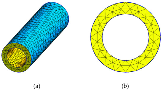 Unstructured meshing of a cylinder with dimensions of 1 mm, 1.5 mm, and 10 mm for the inner radius, outer radius, and length, respectively. (a) Volume view and (b) planar projection view.