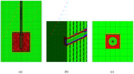 Mixed meshing of the geometry from Figure 2, a hexahedral domain with dimensions of 60 mm × 60 mm × 90 mm. (a) Cross-sectional top view: the tumor zone is marked with a black line, and meshing is performed with three types of geometry: hexahedrons (green), tetrahedrons (red), pyramids (blue), (b) cross-sectional side view and (c) projection view at the port surface.