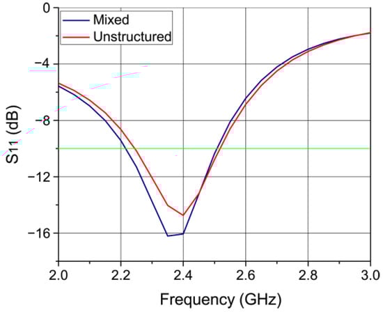 Solving the previously defined equations in the domain of interest with the FEM was performed using GetDP. The mesh generated by Gmsh contains a list of nodes with their coordinates, a list of finite elements with defined element type (line, triangle, quadrangle, tetrahedron, hexahedron, prism, etc.) with a number tag characterizing the physical region to which a particular element belongs and the list of its nodes. The only necessary connection between the mesh and the GetDP is a unique tag of the physical zone defined in the mesh and linked as a group of regions inside the GetDP [45]. All physical definitions were expressed in the GetDP scripting language. All the volume physical zones are joined in a group called a domain. Additionally, the liver and tumor tissues were grouped into a heat zone. We can configure the temperature to only be calculated in the heat zone because we are only interested in the tissue temperature. By solving the electric field vector in the frequency range of 2 GHz to 3 GHz and using Equation (6), we can obtain the values of versus the frequency, as can be seen in Figure 9. Simulations were carried out for the models in Figure 7 and Figure 8, with unstructured and mixed meshing, respectively. We can see that values in both cases are quite similar, and the antenna has good reflection below −10 dB at 2.45 GHz. The rest of the analyses is focused only on a frequency of 2.45 GHz and an input power of 13 W.