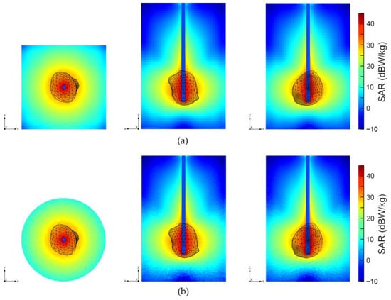 The SAR represents the amount of radiation absorbed by a tissue [25]. It can identify which part of the tissue will be the most affected by radiation and how the electric field propagation interacts with the tissue. It can be determined from the electric field, electric conductivity , and density of the observed domain , as follows: