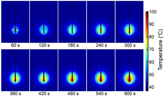 Microwave ablation (MWA) has been shown to be effective in treating certain types of cancer, including liver, lung, and kidney tumors [1,2,3,4]. It is a minimally invasive medical procedure with a short recovery time, making it a viable alternative to traditional surgical methods [5,6,7]. During MWA, a small needle-like probe is inserted into the tumor, and microwave energy is delivered to heat and destroy cancer cells [8,9]. Multi-slot coaxial antennas are commonly used for the delivery of microwave radiation because of their simplicity, low complexity, and ability to generate highly spherical ablation zones [10,11]. To improve the safety and efficacy of the procedure, modeling MWA is an important tool for predicting the size and shape of the ablation zone and optimizing treatment for individual patients [12,13].