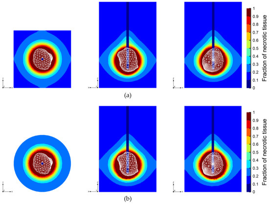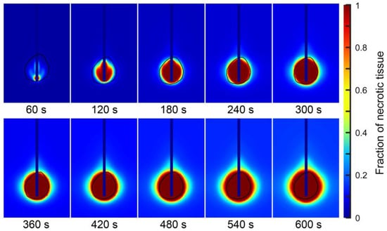 where 7.39 × 1039 1/s and 2.577 × 105 J/mol represent the frequency factor and activation energy for the irreversible damage reaction, respectively; is the temperature calculated at each point of the model region, and is the universal gas constant. By solving differential Equation (18), the fraction of necrotic tissue can be calculated as follows [55,56]: