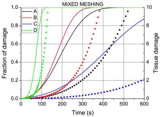 The fraction of necrotic tissue changes with time at the four points (A, B, C, and D) for mixed meshing (full lines) and tissue damage (dots of the same color).