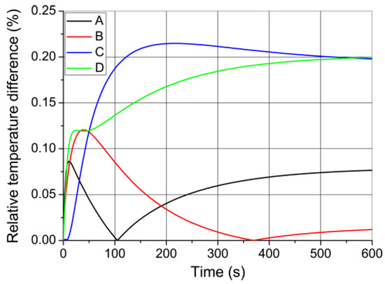 where T2mm and T1mm are the temperature values at the control point for the models with maximal mesh sizes of 2 mm and 1 mm, respectively. As shown in Figure 17, the maximal absolute relative temperature difference is around 0.2% which is acceptable in this and most other models, and is below the typically desired value of 1% [60,67]. Hence, the new mesh model does not give any significant difference compared to the initial one, at the cost of much more DOFs and simulation time.
