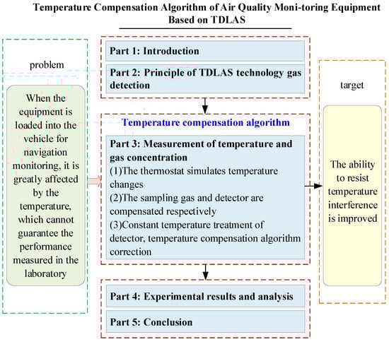 From the discussion and analysis of the above literature, it can be seen that temperature compensation is very important for the accuracy and stability of spectral measurement results. This paper solves the problem of temperature compensation in TDLAS technology measurement from the perspective of engineering. Aiming at the problem that the concentration value measured by the detection module is obviously interfered with by temperature and the regularity is not strong, the influence factors of temperature are divided into two parts, and the temperature compensation algorithm based on the empirical formula is designed to correct the detector and the sampling gas, respectively. According to the compensation effect, the temperature compensation scheme is designed so that the detector adopts constant temperature control while the sampling gas temperature compensation reduces the interference of temperature with the detection equipment and improves the application value of the detector. The main research contents of this paper and their relationships are shown in Figure 1.