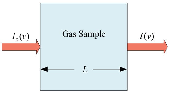 The absorption spectrum theory of gas molecules reveals the relationship between the energy absorbed by gas molecules and their internal energy level structure. The Lambert-Beer law describes the attenuation relationship between transmitted light and incident light when monochromatic light with a specific wavelength passes through the gas to be measured, as shown in Figure 2. When an incident laser passes through the measured gas, if the wavelength and frequency of the laser are consistent with a certain absorption frequency of the measured gas, the energy of the laser will be absorbed by the measured gas [15], and the incident laser will be attenuated into the outgoing laser. The attenuation of laser energy can be obtained by Lambert–Beer’s law.