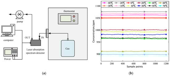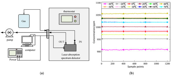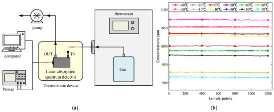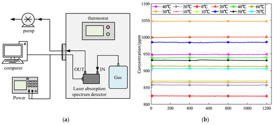 (a) Laser Absorption Spectroscopy Detector Variable Temperature Test Schematic; (b) Laser Absorption Spectroscopy Detector Variable Temperature Test 10 min concentration acquisition data.