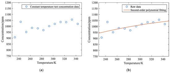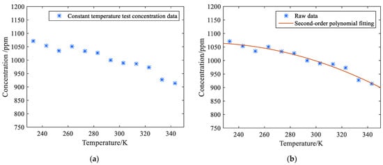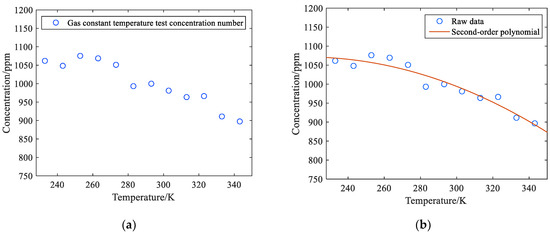 As shown in Figure 11a, as the temperature of the laser absorption spectrum detector increases, the methane concentration obtained by the system test shows an overall upward trend, and the correlation coefficient R = 0.1893 is significantly lower than the correlation coefficient in the gas temperature experiment to be measured. The correlation degree is not high because the temperature change has a great impact on the laser, photoelectric sensor, and other components inside the detector. According to the test results in Table 4, quadratic polynomial fitting was performed for the relationship between methane gas concentration and temperature, and the equation obtained is shown in Equation (21).
