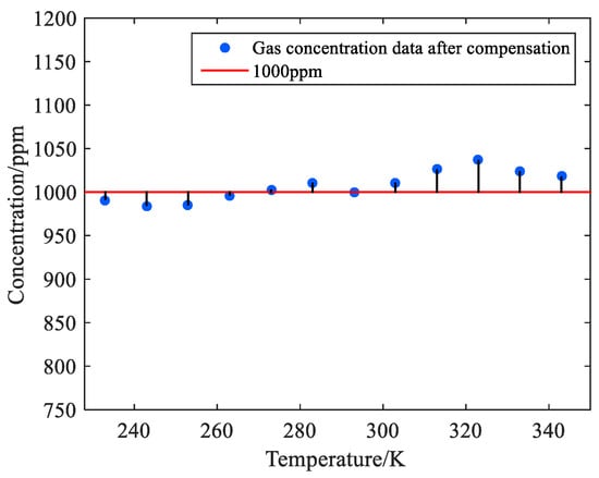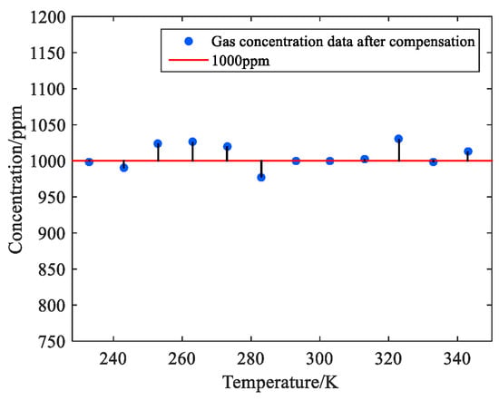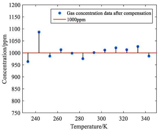 The methane concentration data measured at different temperatures were put into Equation (20) for correction. Compared with the experimental results of methane gas with a 1000 ppm concentration in Figure 8a, it can be seen that the influence of external temperature on test results can be effectively reduced after adding temperature correction. The concentration results after compensation are plotted in Figure 9.